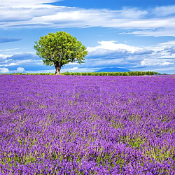 Дерево в лавандовом поле на рассвете в Провансе, Франция