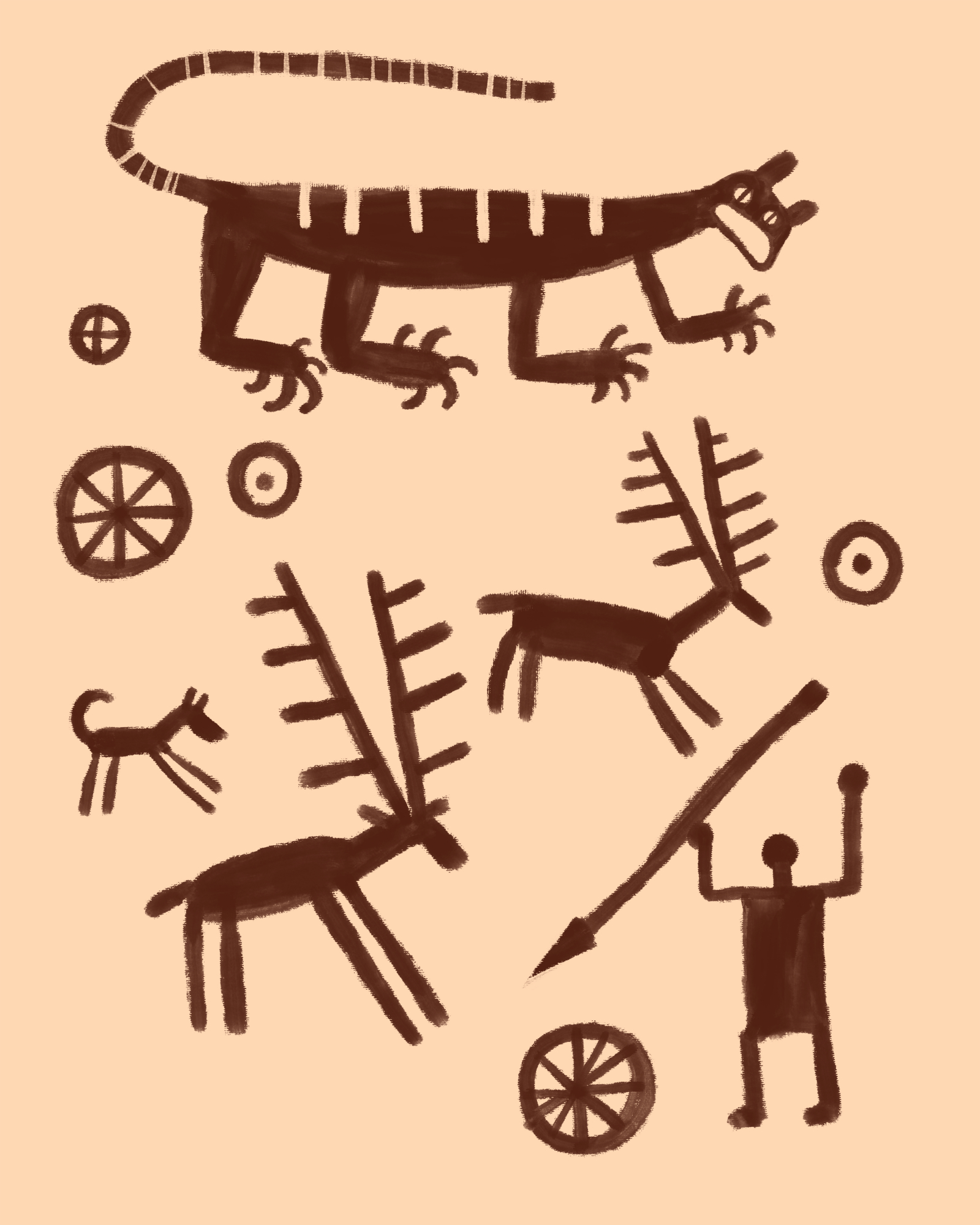 Картины стилизованы под наскальную живопись.